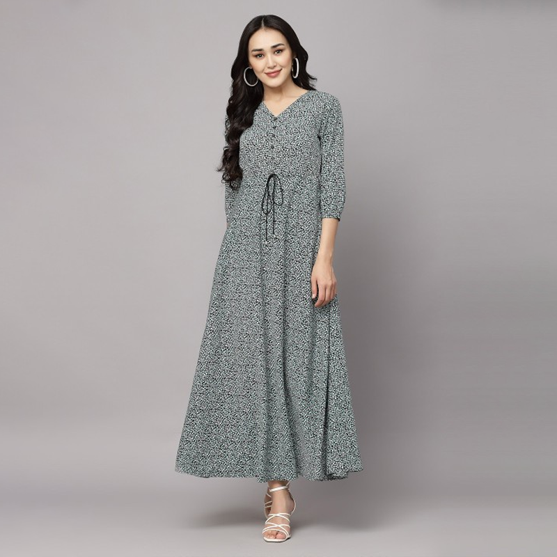 Women V-Neck Ethnic Motifs Print Ruffles Maxi Dress