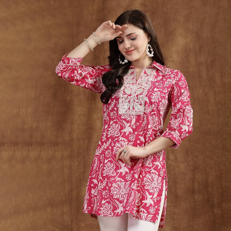 Shirt Collar Printed Cotton Cambric Tunic